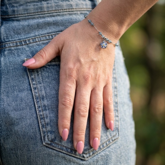 Jeśli szukasz bransoletki z żywicy z suszonymi kwiatami i kamieniami naturalnymi, która łączy delikatność formy z naturalną symboliką — ta Aura z niezapominajką, akwamarynem i hematytem będzie pięknym, spokojnym wyborem 🤍