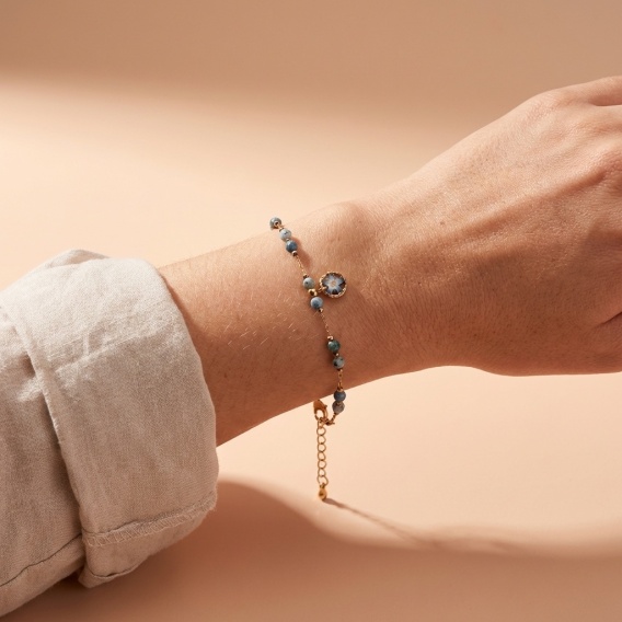 Ręcznie wykonana bransoletka z kolekcji Aura łączy w sobie prawdziwą, suszoną niezapominajkę oraz naturalny kamień K2 z hematytem, zatopione w przejrzystej żywicy jubilerskiej. Delikatny, złoty łańcuszek ze stali chirurgicznej sprawia, że biżuteria jest lekka, wygodna i idealna na co dzień. Każdy egzemplarz powstaje w małej pracowni Tales by Nature we Wrocławiu, dzięki czemu jest unikatowy i pełen naturalnego uroku.