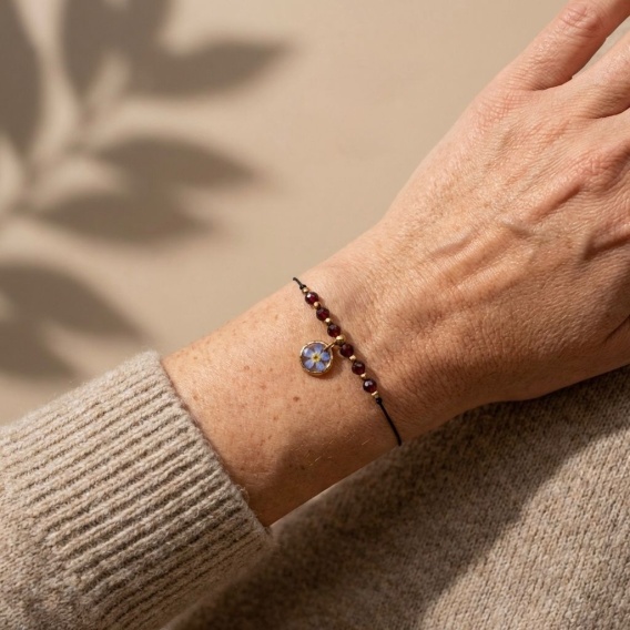 Wyjątkowa bransoletka z przesłaniem odwagi i radości życia. Niezapominajka przypomina o bliskości i ważnych chwilach, a granat dodaje siły i odwagi, żeby iść przez życie z radością. Dopełnia go hematyt minerał siły i stabilności, nadający pewności i odwagi w codziennym życiu.