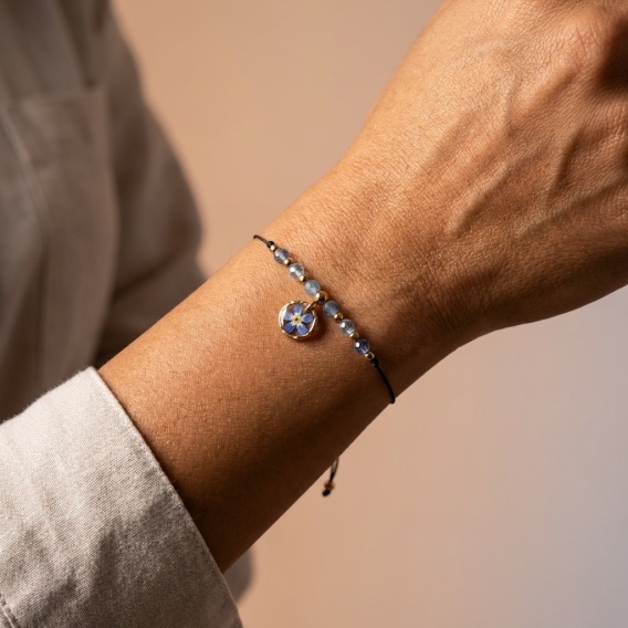 Wyjątkowa bransoletka, która stanowi subtelne połączenie delikatnej niezapominajki – symbolu pamięci i wierności – z topazem, kamieniem jasności myśli, siły i pozytywnej energii oraz akwamarynem, kamieniem ochorny, spokoju i harmonii. Dopełnia je hematyt - minerał siły i stabilności, nadający pewności i odwagi w codziennym życiu. Idealna dla tych, którzy chcą czuć radość, a jednocześnie spokój i spełnienie wspominając ważne momenty swojego życia.