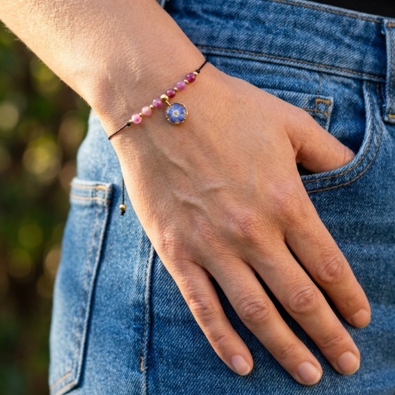 Wyjątkowa bransoletka, która stanowi subtelne połączenie delikatnej niezapominajki – symbolu pamięci i wierności – z różowym turmalinem, który nazywany jest kamieniem miłości, ale również chroni przed złą energią, wszystkim tym, co nie sprzyja. Idealna dla tych, którzy pragną miłości i radości w swoim życiu i chcą czuć się bezpiecznie wspominając ważne momenty swojego życia.