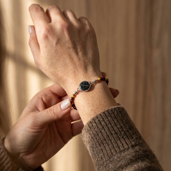 Wykończona elementami ze stali chirurgicznej w kolorze srebra, bransoletka łączy w sobie elegancję z siłą natury. To nie tylko ozdoba, ale talizman dla osób szukających głębszego kontaktu z samym sobą i z przyrodą.