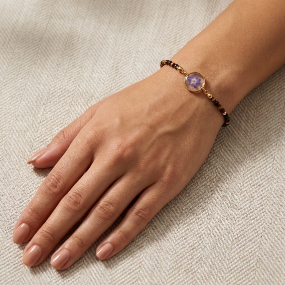Ta bransoletka z kolekcji Florastone to połączenie subtelnej wolności z potężną energią ziemi. Niezapominajka zatopiona w żywicy symbolizuje trwałość uczuć, bliskość duchową i czystość wspomnień – tych, które zostają z nami na zawsze.