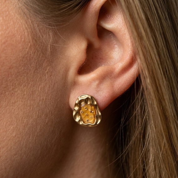 Delikatne kolczyki sztyfty z geometrycznym wykończeniem, w których zatopiliśmy kwiaty dzikiej marchwi na złotym tle, czyli pokruszonej złotej mice. Każda para jest ręcznie wykonana i lekka – idealna zarówno na co dzień, jak i na specjalne okazje.