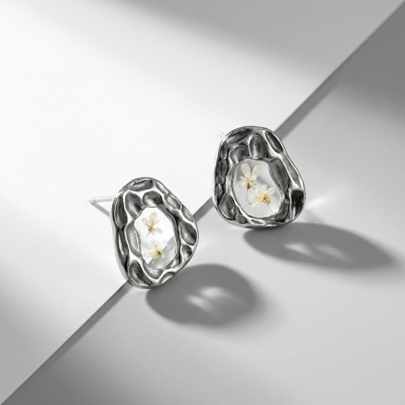Kolczyki sztyfty z żywicy z zatopionymi kwiatami Rozkwit geometryczne kwiaty dzikiej marchwi srebrne