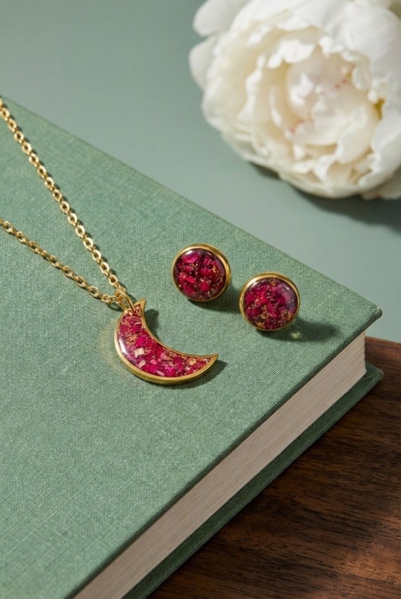 Komplet biżuterii z żywicy Księżyc Płatki róży