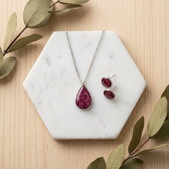Każda biżuteria tworzona jest z półfabrykatów ze stali chirurgicznej, żywicy epoksydowej / jubilerskiej oraz suszonych naturalnych kwiatów i kamieni naturalnych.