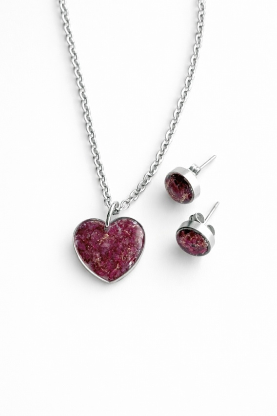 Komplet biżuterii z żywicy Srebrzyste serce Płatki piwonii