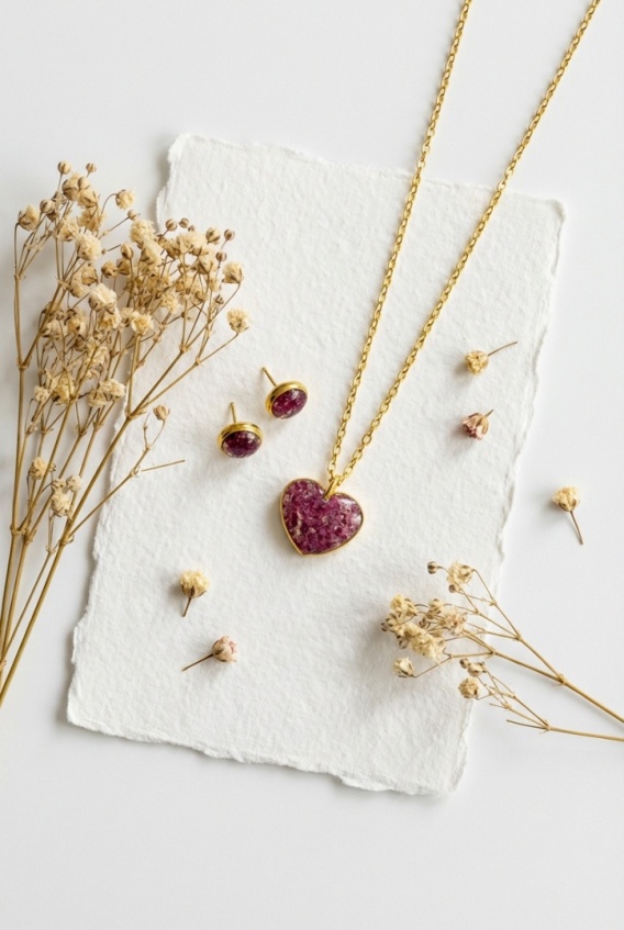 Każda biżuteria tworzona jest z półfabrykatów ze stali chirurgicznej, żywicy epoksydowej / jubilerskiej oraz suszonych naturalnych kwiatów i kamieni naturalnych.