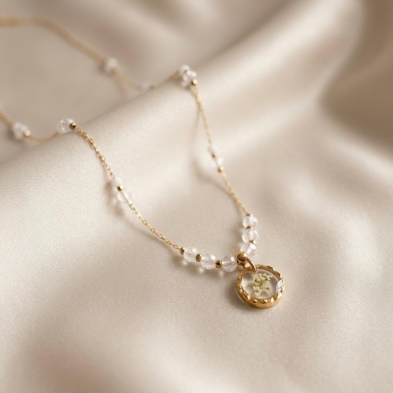 Naszyjnik z żywicy Aura z kwiatami dzikiej marchwi i kryształem górskim