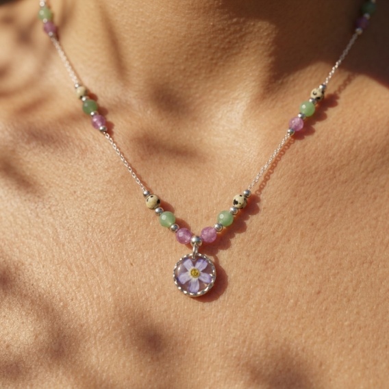 Jeśli szukasz biżuterii z żywicy z suszonymi kwiatami i kamieniami naturalnymi, która łączy naturę z emocją — ten naszyjnik Aura z niezapominajką, awenturynem, turmalinem różowym i jaspisem dlamatyńskim będzie wyjątkowym wyborem.