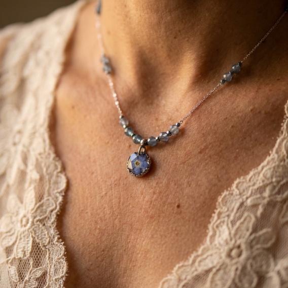 Jeśli szukasz biżuterii z żywicy z suszonymi kwiatami i kamieniami naturalnymi, która łączy naturę z emocją — ten naszyjnik Aura z niezapominajką, akwamarynem i hematytem będzie wyjątkowym wyborem.