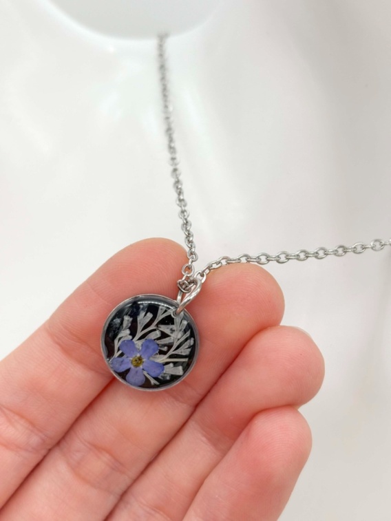 Naszyjnik z żywicy Niezapominajki i biała paproć