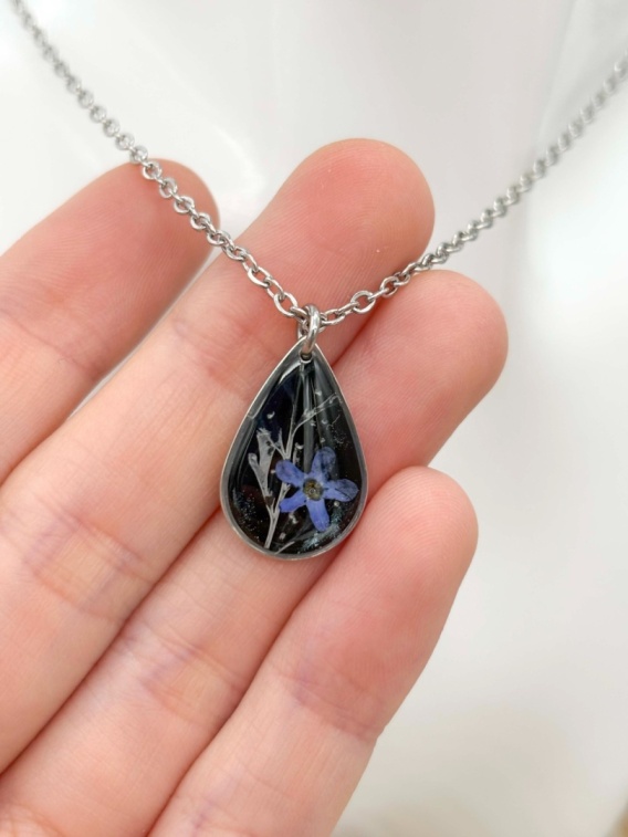 Naszyjnik z żywicy Niezapominajki i biała paproć srebrzysta kropla