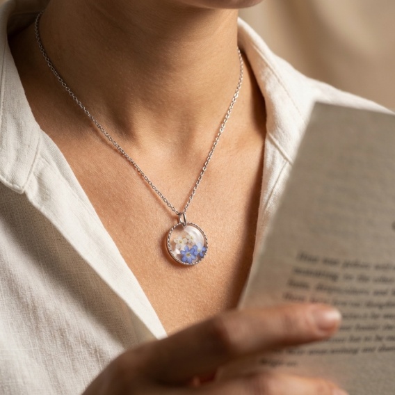 Naszyjnik z żywicy Niezapominajki i dzika marchew srebrzyste