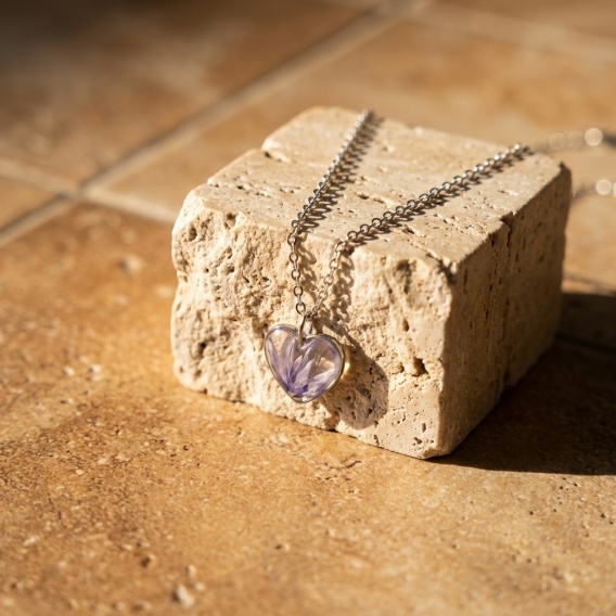 Naszyjnik z żywicy Serce Fioletowe Chabry srebrzyste midi