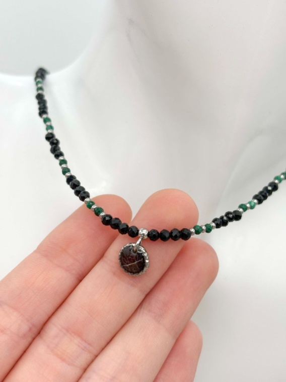 W tym naszyjniku z kolekcji Esencja liścia szkielet liścia, widoczny na czarnym tle zawieszki, to symbol przemijania, ale też siły ukrytej w delikatności.. Turmalin czarny chroni i uziemia, wprowadzając poczucie bezpieczeństwa i spokoju, a malachit dodaje harmonii i wewnętrznej siły, wspierając przemiany i równowagę.