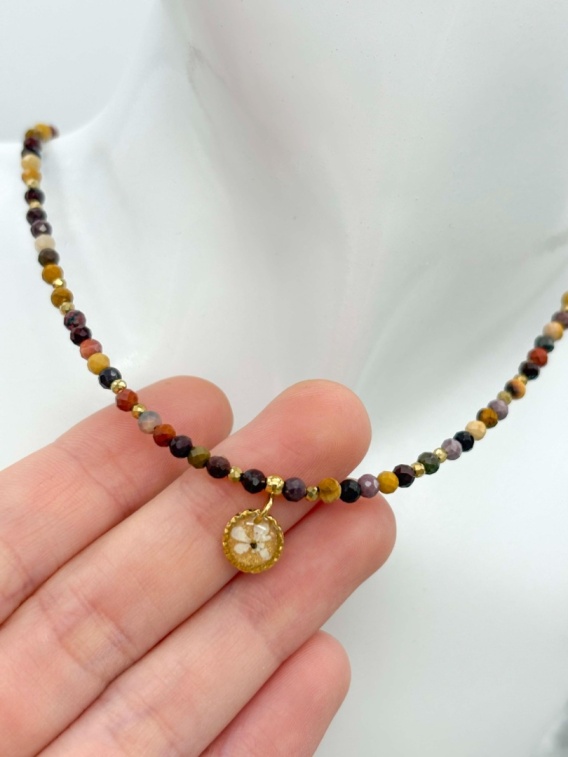W tym naszyjniku kwiat dzikiej marchwi na złotym tle wnosi naturalną delikatność i ciepło, jak promienie słońca muskające letnią łąkę. Mokait dodaje harmonii i wewnętrznej równowagi, wspierając odwagę w codziennych wyborach. Całość ugruntowuje hematyt, przynosząc stabilność i poczucie bezpieczeństwa.