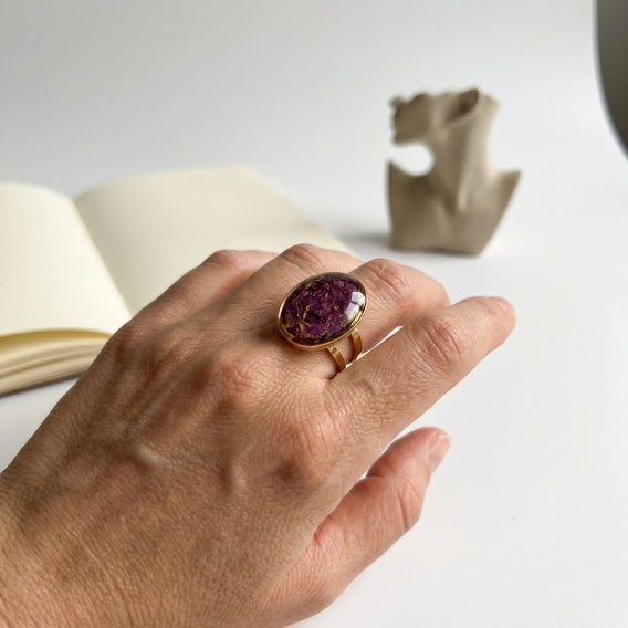 Pierścionek z żywicy regulowany sygnet duży Złociste Płatki piwonii